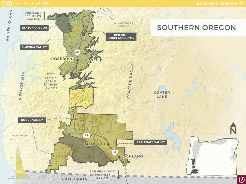 This map is a great resource for breaking down the locations of the exceedingly large Southern Oregon AVA.